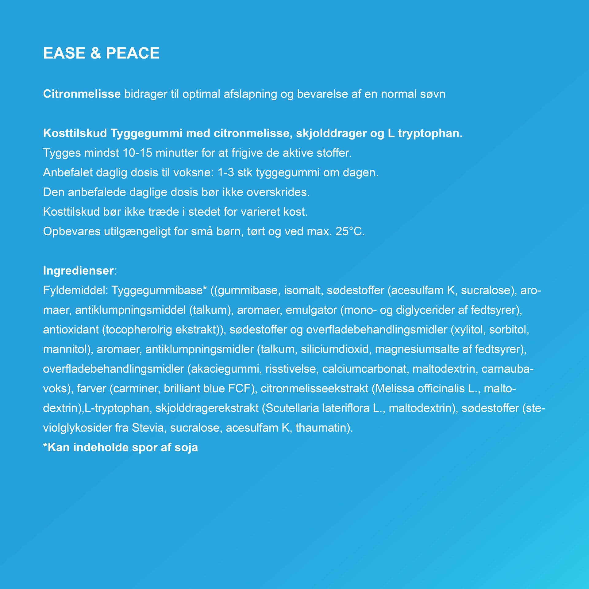 EASE & PEACE kombinerer citronmelisseekstrakt, som bidrager til optimal afslapning og en sund søvn, med L-tryptophan og Scutellaria lateriflora.